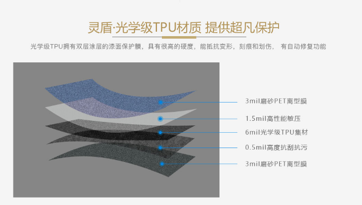 灵盾甄选全球优质TPU基材,配合先进涂层技术,具有优异的耐高温、耐刮蹭、耐磨、耐黄变等性能,持久耐用。涂层具有荷叶疏水结构,酸雨、污水等不易附着漆面,可以有效保护爱车漆面避免遭受外界损伤。